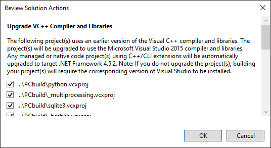 Open pcbuild.sln with Visual Studio 2015. You will be warned that projects use an older version of Visual C++ compiler and asked if you’d want them to be upgraded: